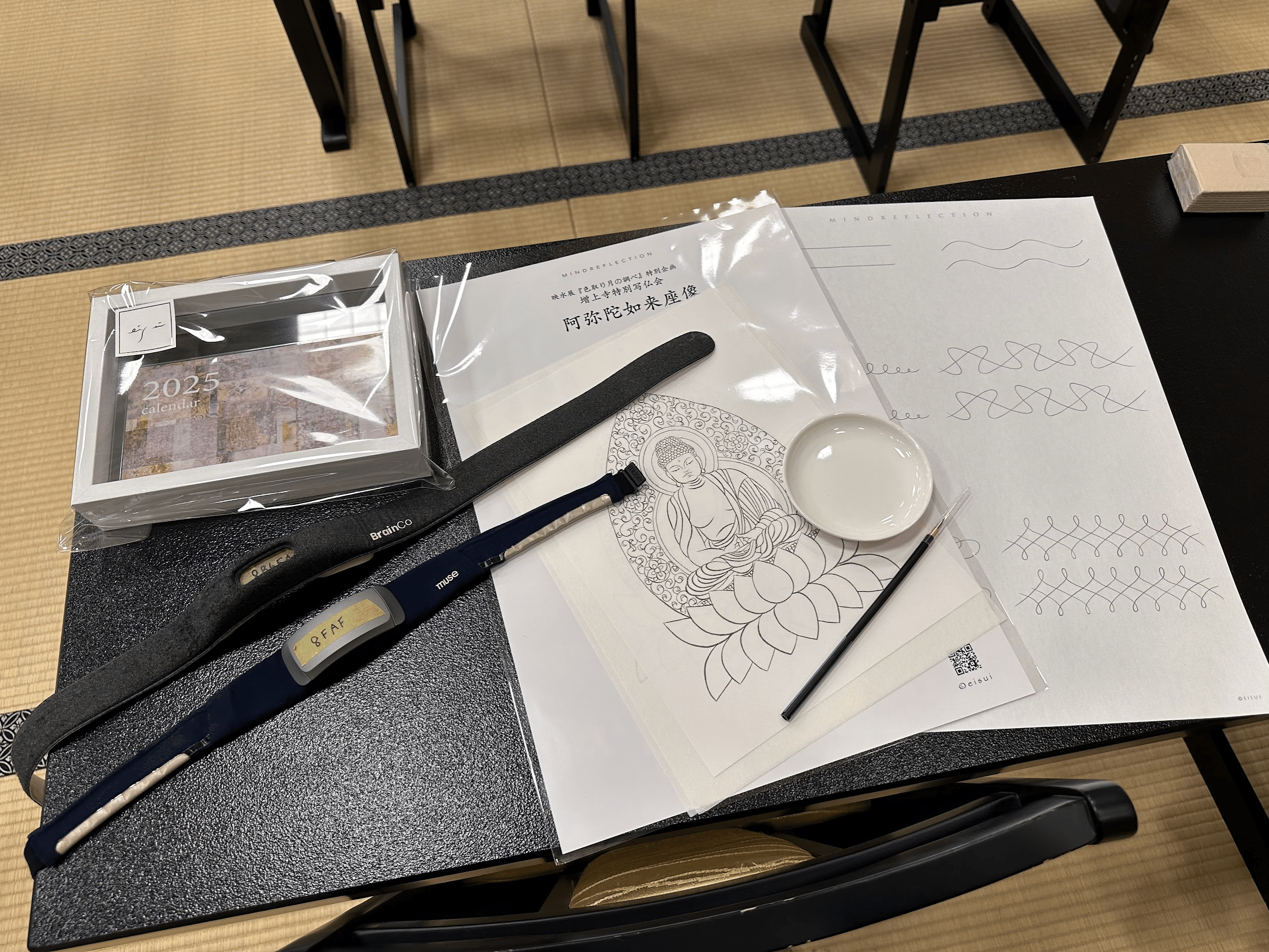 こちらは2025年のもの増上寺御本尊である木造阿弥陀如来坐像を模した映水オリジナルの特別お手本をご用意させていただきます。このお手本は増上寺写仏会のみで写仏していただける限定お手本になります。