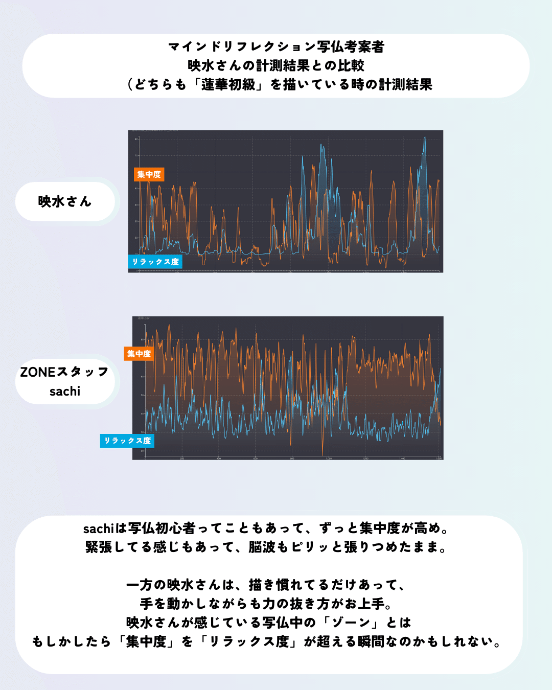 映水さんは以前から写仏時の脳波計測に取り組んでおられます。また、ZONEの中の人も写仏中の脳波を計測しています。