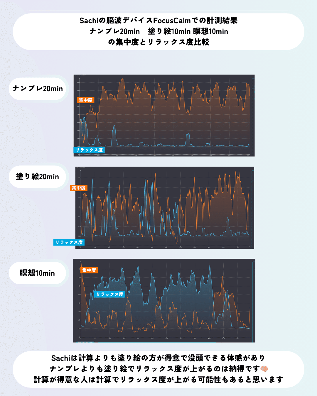 先日メンバー様限定アカウントで、FocusCalmをつけながらナンプレ・塗り絵・瞑想でしながら脳波計測したのですが、とってもわかりやすく結果に違いが出たので共有しておきます✊ 中の人は塗り絵の方がリラックス度出てますが、計算得意な人は計算でも出ると思います!