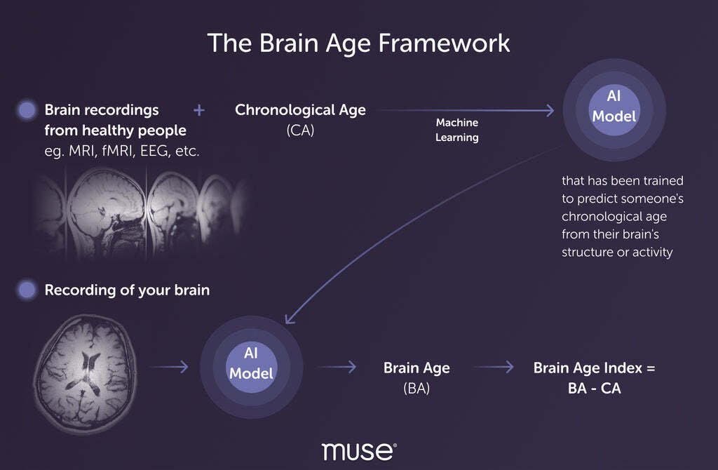 研究者たちは、脳の構造や機能の加齢に伴う変化パターンを分析することで、脳の記録(MRI、EEGなど)から人の脳年齢を予測し、実年齢(実年齢)からの偏差を調べることができるAIモデルを開発しており、これを脳年齢指数と呼んでいます。