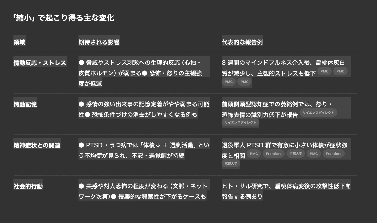chatGPTに聞いた扁桃体の縮小による影響扁桃体は側頭葉の奥にあるアーモンド形の小さな構造で、恐怖・不安・怒りなどの情動処理、ストレス反応、情動記憶の固定化をつかさどります。メイヨークリニックの2023年の研究では、マインドフルネステクニックをサポートするためにMuse Sヘッドバンドを使用した医療従事者のストレスと燃え尽き症候群が54%大幅に軽減され、生活の質と認知能力が向上したことが示されました。